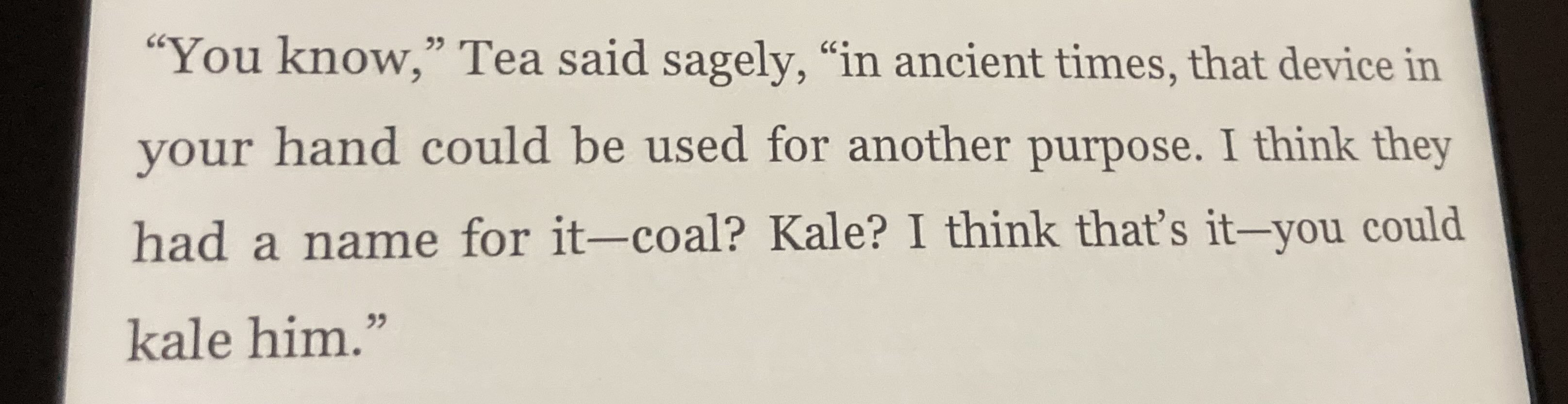 I only had the one instance of wanting to throw the book so that’s not too bad. Humor throughout.