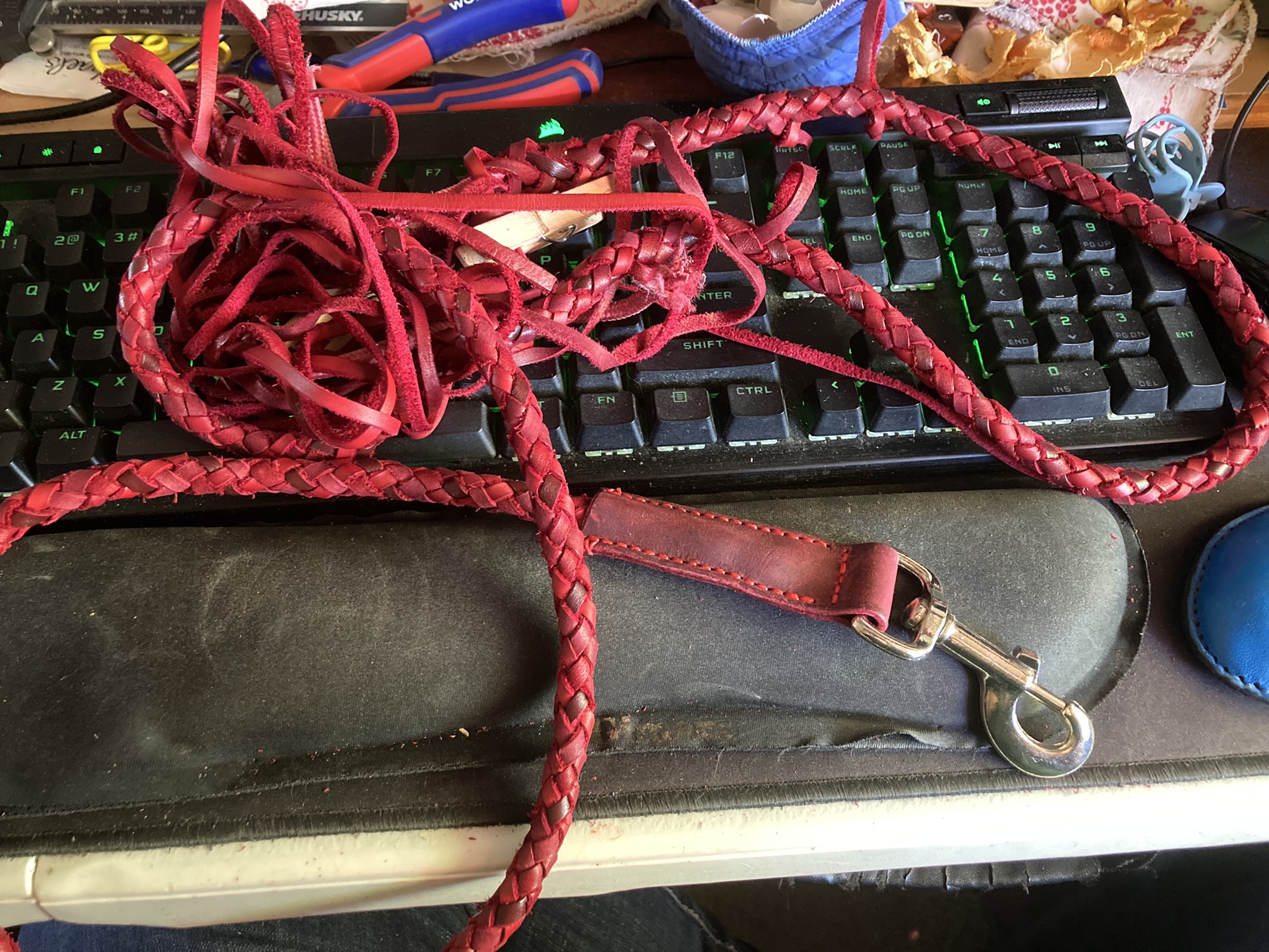 All the leather used in this piece were scraps, which I thought was really cool. I had bought a tool to make leather lace from scraps, and have used it here and there, but this was the first time I was intentionally using it for a project. I’d planned on dying some strands black but in the end everything was dyed red. The differences in the base leathers brought out some nice color variations in the reds that makes the overall color of the leash deep and interesting to look at.